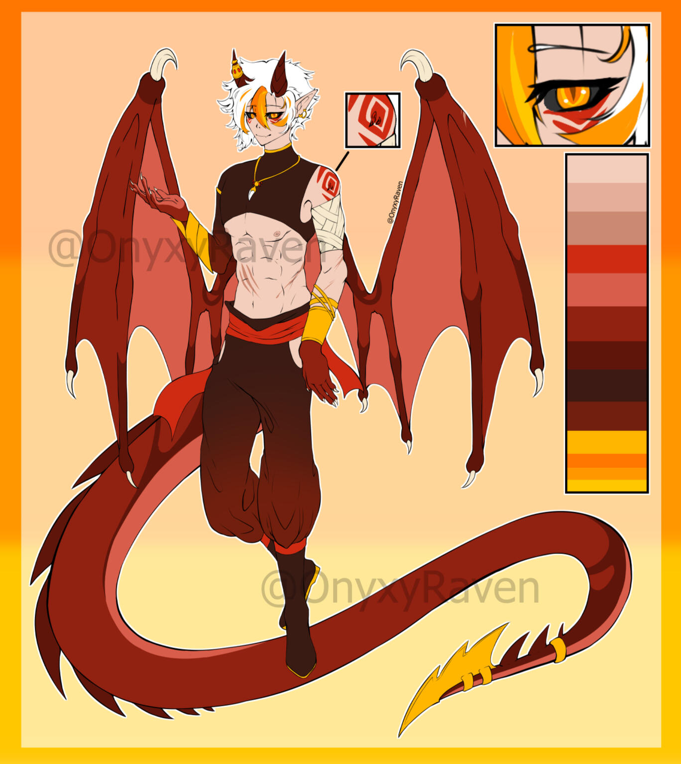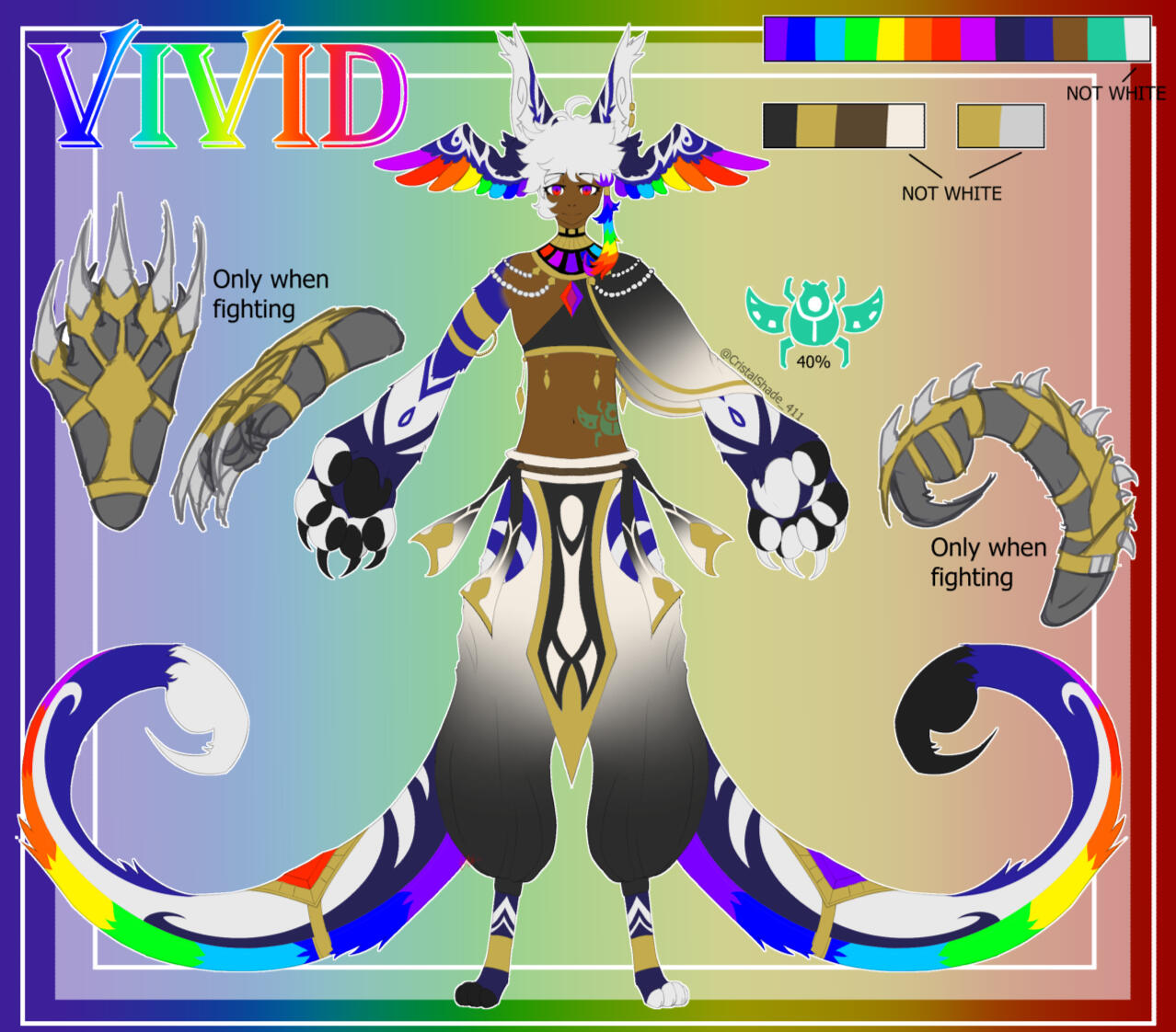 One symetrical headshot, Front/Back view if humanoid, 2 sides if feral, color palette, eyes close-ups, mouth close up, back close up, name.